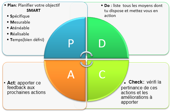 On peut appliquer le concept de la roue de Deming appelé aussi (PDCA) qui est orienté organisation et qualité entreprise à notre stratégie d’amélioration continue ;